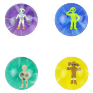 45 mm Alien 3DHigh Bounce Balls - These superballs are out of this world!The bold and bright balls each feature one of six plastic alien figures sealed inside giving them a 3-D look.They are ideal for your vending machine, and they also make great redemption prizes, giveaways, goody bag fillers, and more. Pick up these extra-cool extraterrestrials for your collection today!