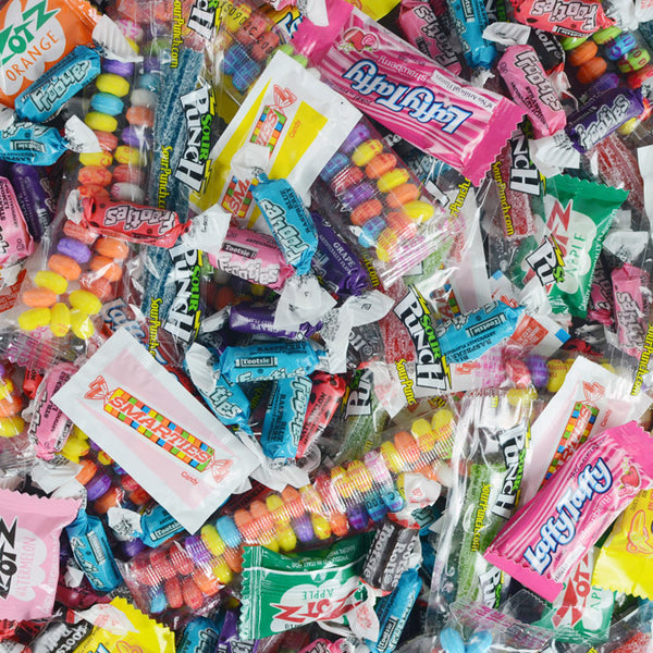 - Contents: Smarties, Candy jewelry, Licorice, Tootsies (multiple flavors), and Willy Wonka items