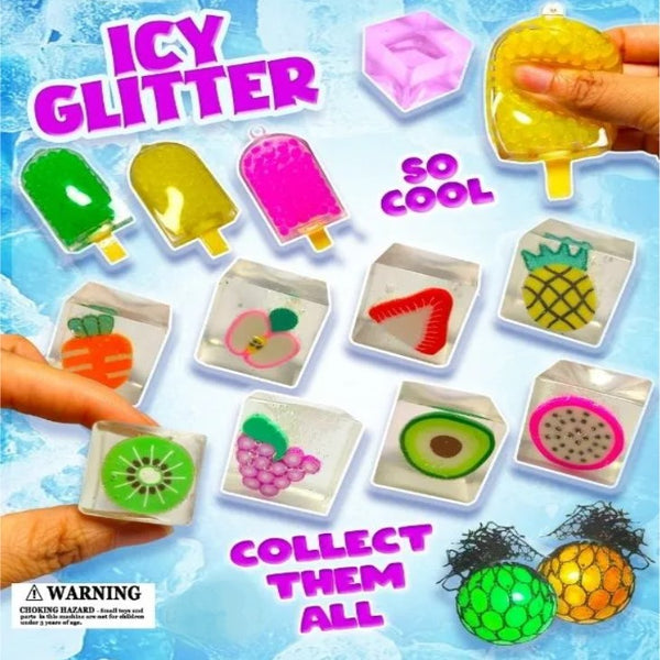 Icy Glitter in 2-Inch Toy Capsules - Introducing Icy Glitter in 2" Capsules! Our new and exciting mix includes Squishy Ice Cubes, Beady Popsicles, and glittery mesh balls - perfect for any vending rack. Keep your customers coming back for more with this must-have assortment of best-selling items. Get yours today!