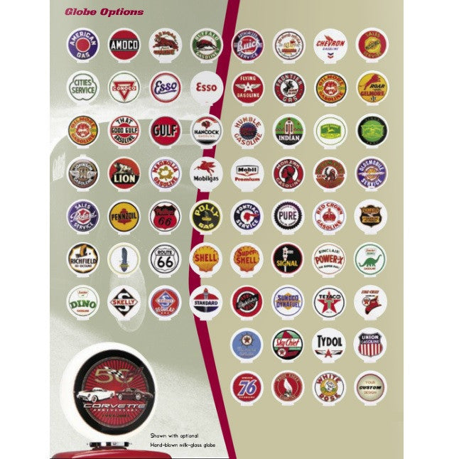 - Globe Topper Logo: Select one of the stock nostalgic gasoline and automotive logos including: Amoco, Conoco, Dino, Esso, Mobil, Pennzoil, Shell, Sinclair, Texaco, and Union 76. Use your own business or custom logo. Additional charges may apply to custom logos depending on the complexity. Call us to see what we can do.